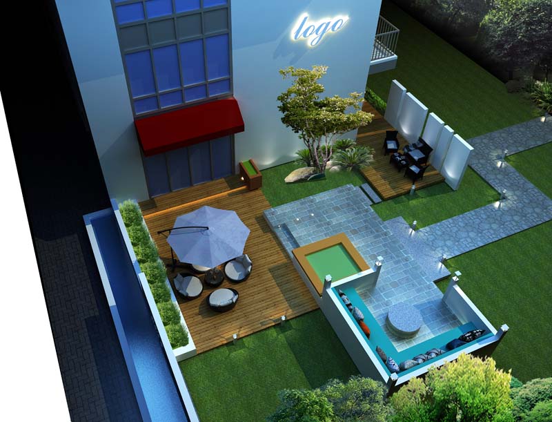 先從外觀布局講起:采用“露營(yíng)”式野趣為設(shè)計(jì)主調(diào),純白色外墻立面,搭配發(fā)光字體品牌LOGO,在黑夜中熠熠生輝;暗紅色雨棚設(shè)計(jì),與青翠綠色草地在顏色上形成鮮明對(duì)比;花崗巖碎石地磚鋪就一條草間小路,連接起分布在外院不同角落的休息洽談區(qū)域,形成“散而不亂”的空間布局效果。