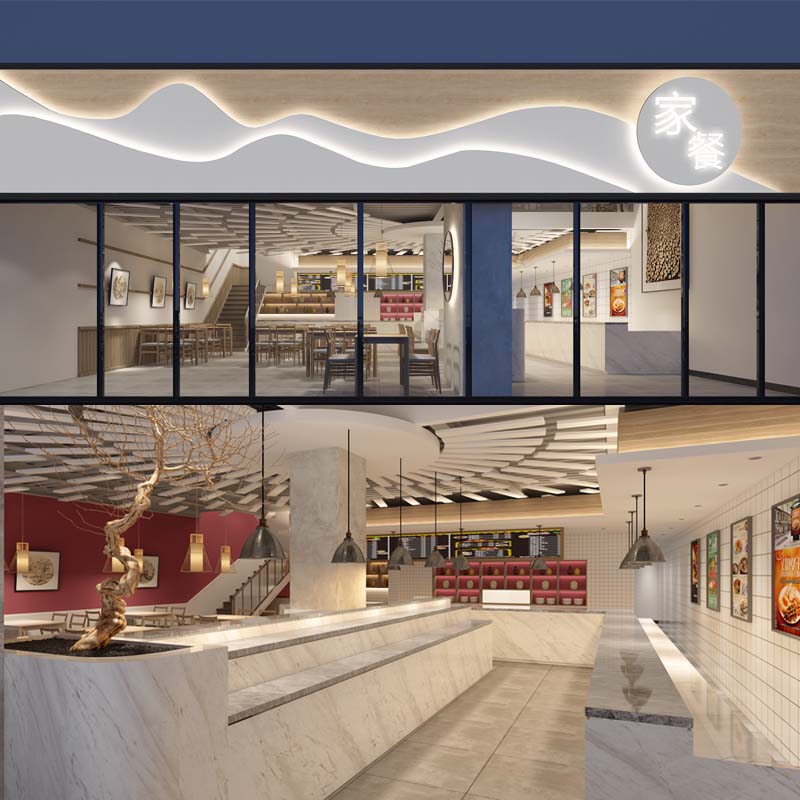 本案例家餐-新中式自助簡餐廳裝修由燦源裝飾全程設(shè)計(jì)深化與施工。餐廳地址位于:五象新區(qū)萬科大廈B107商鋪,共2層,單層180平米,loft風(fēng)格,360平。