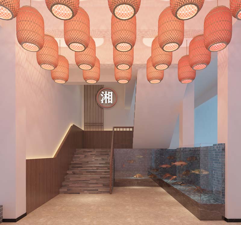 中式仿古設計是這次餐廳設計裝修的主調(diào)風格,線條簡潔硬朗的明制桌椅、隔而不斷的木質(zhì)造型隔斷、鏤空竹編造型燈具、深灰色渲染花色大理石……是“西湘記”的主要構成元素,簡單的白色墻面做打底,搭配點綴的立柱包邊設計及墻面上的大幅裝飾畫,達到既能映襯中式風格的意蘊,又不會喧賓奪主,影響餐廳整體設計效果。